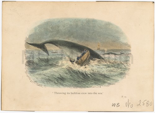 Throwing its Luckless Crew into the Sea. p. 25 Colored illustration depicting a whale 'sounding' and in the process pushing a …