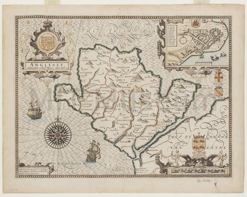 Anglesey-Antiently called Mona Hand-colored map of the island of Anglesey with an inset of Beaumaris, …