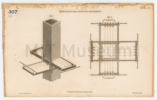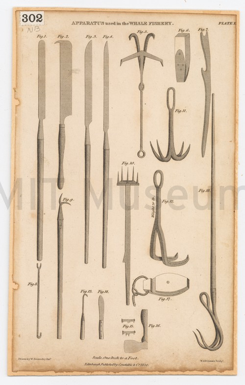 Apparatus used in the Whale Fishery. Plate X Tools used to process whale blubber. Items are numbered for identification in …