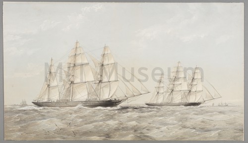 Approaching the Finish Line. Clipper Ships Racing for the Harbor A depiction of the final tense moments of the British tea clipper …