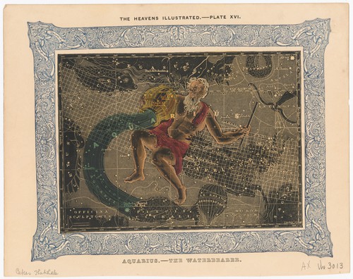 Aquarius - the Waterbearer Printed star chart with a printed blue ink border and central constellation …