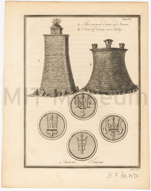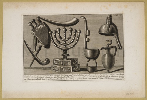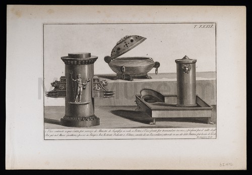 Antichi Monumenti. Engraving depicting several antique objects including a decorative plinth and a perforated …
