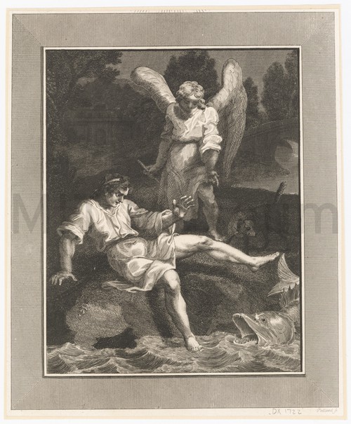 Angel over man and dolphin Monochrome engraving with heavy chiaroscuro. A young man in a simple robe …
