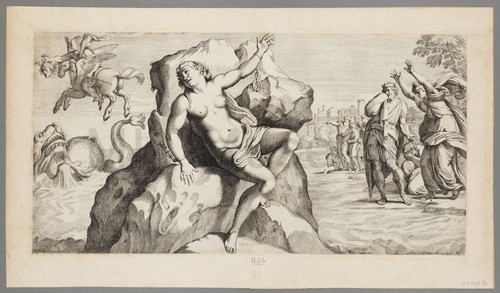 Andromede Fille de Cassipee Reyne Monochrome engraving of Perseus and Andromeda. Andromeda is chained to a rock …