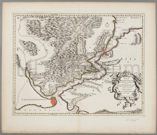 Anaplus Bosphori Thacii hand-colored copperplate engraving of the straits of Bosphorus, centered on the region …