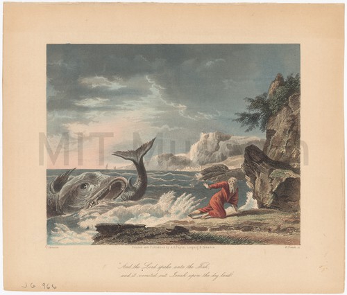 And the Lord Spake unto the Fish, and it vomited out Jonah … Hand-colored engraving depicting the whale (which has both baleen and fangs) spitting …