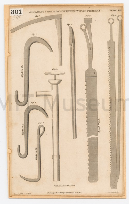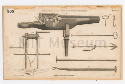 Apparatus used in the Northern Whale Fishery. Plate 19 Black and white engraving of whaling tools. Items are numbered for identification …