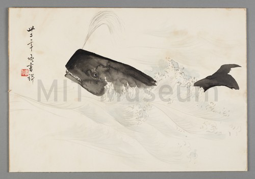 Whale attacked by fishes Colored engraving of a large spouting whale with teeth, facing left, being …