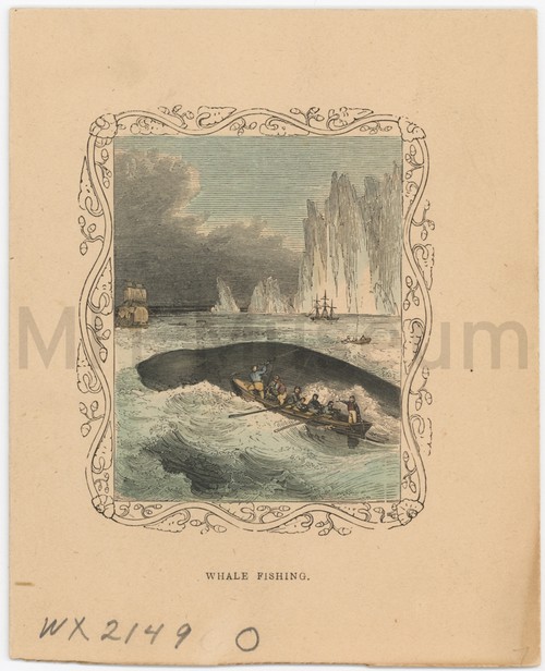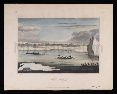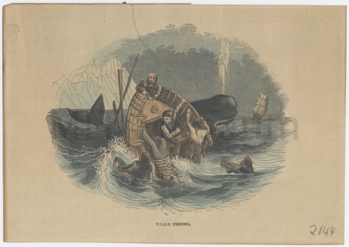 Whale fishing Colored engraving depicting a rowboat drawing up beside a large whale, and …