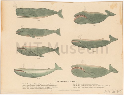 Whale fishery Colored print showing seven types of whales, labeled, with a legend identifying …