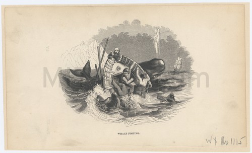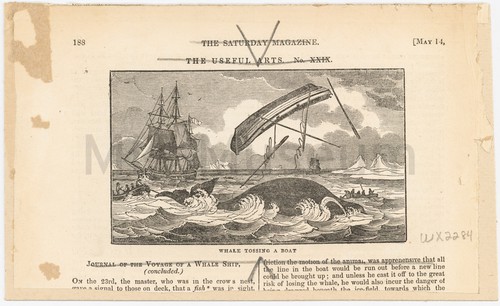 Whale tossing a boat Monochrome clipping from The Saturday Magazine, with a woodcut entitled "Whale Tossing …