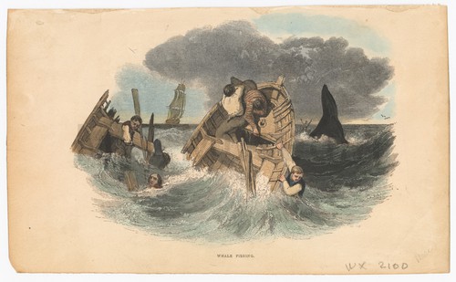 Whale fishing. Hand-colored engraving depicting an upturned whaleboat with men clinging to it. Other …