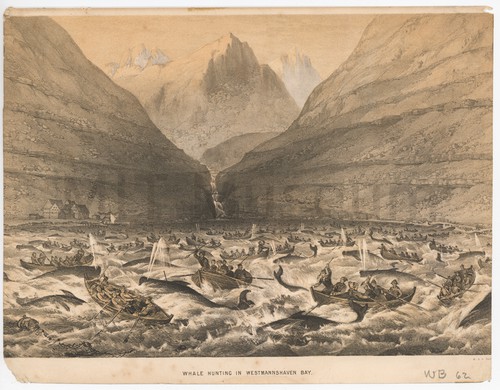 Whale Hunting in Westmannshaven Bay Colored lithograph illustrates the classic Faroe Islands whale hunt in Westmannshaven Bay, …