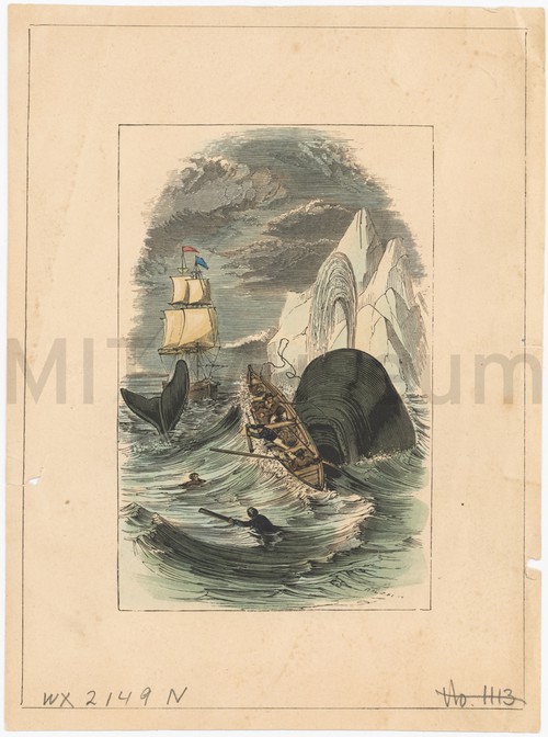 Whale attacking whale boat Colored engraving depicting a spouting whale, with mouth wide open, upsetting a …