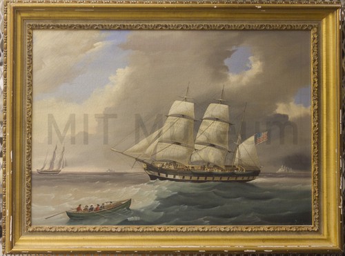 Whaler in the Arctic, with whale boat returning after the chase Port-side view of whaleship flying American flag in the right middleground; whaleboat …