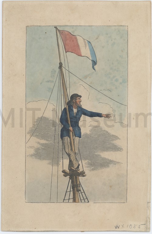 Whale man at masthead on the lookout for whales Colored woodcut of a bearded man in a sailor's hat, a blue …