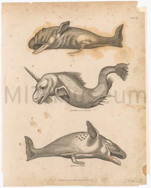 Whale, Narwhale or Sea Unicorn, Spermaceti Whale Plate 47 Monochrome engraving showing a male whale, labeled "Whale", a heavily stylized narwhal …