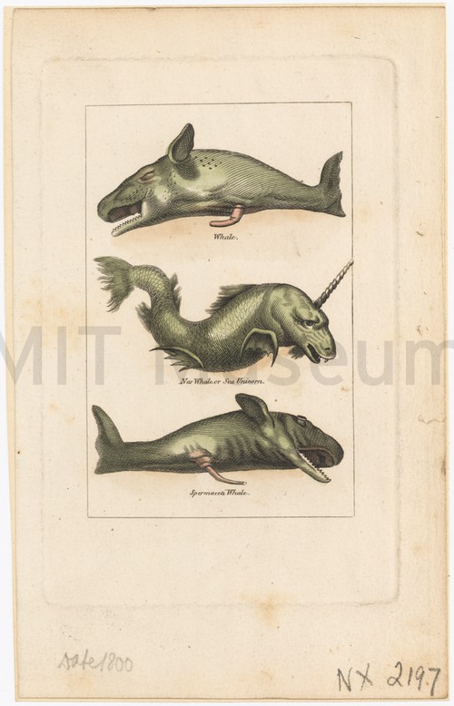 Whale, Nar Whale or Sea Unicorn and Spermaceti Whale Colored image with side views of, top, a male whale with teeth, …