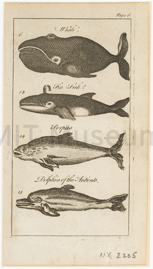 Whale, Fin Fish, Porpoise, and Dolphin Monochrome engraving from a natural history text labeled "Page 6" and showing, …