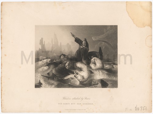 Whalers attacked by Bears Monochrome engraving after a painting by Biard of three whalers in a …
