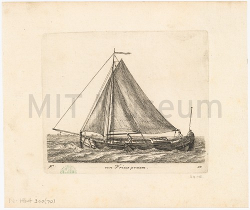 een Friese praam Etching depicting a view of a single-masted flat bottomed boat at sea, …