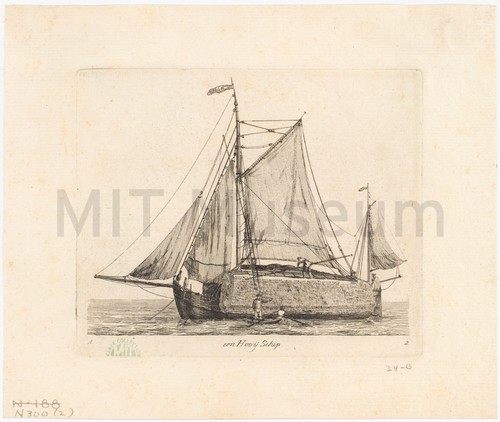 een Keulenaar of Sammereus Etching depicting a side view of a heavily-loaded cargo ship at sea. …