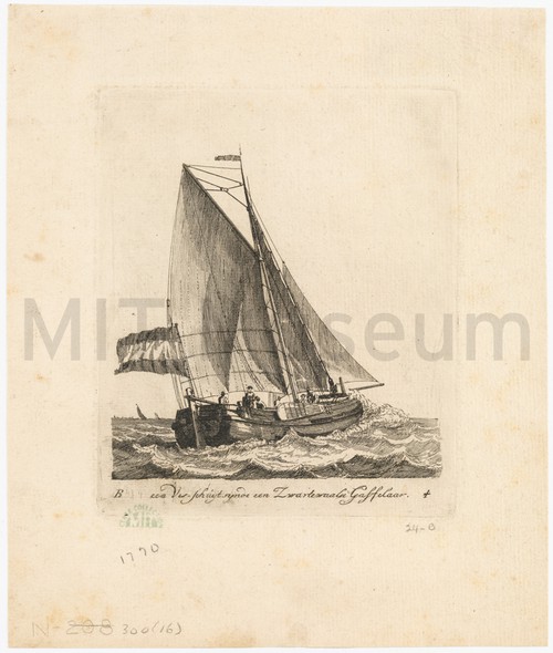 een Vis-schuyt synde een Zwartewallse Gaffelaar Etching depicting a view of a single-masted ship flying the Dutch flag …