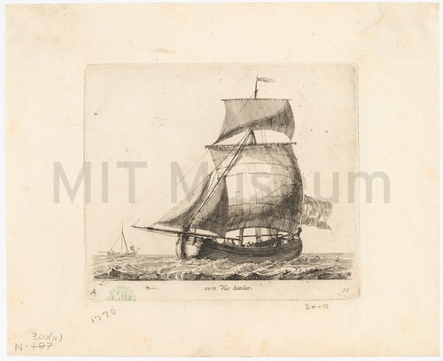 een Vis hoeker Etching depicting a three-quarters bow view of a hoeker--a small, flat bottomed …