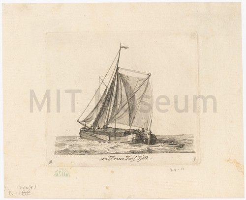 een Turfschiut met een Emmerzeil Etching depicting a view of a barge with an emmerzeil, a trapezoid-shaped …