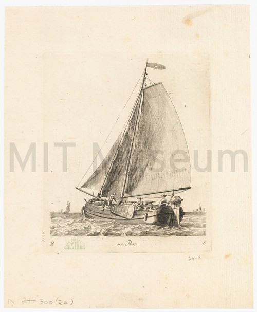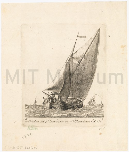 een Boeyer Etching depicting a side view of a single-masted vessel at sea, with …