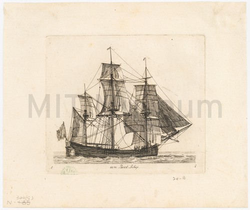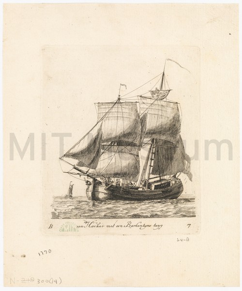 een Hoeken met een Barkentyn tuyg Etching depicting a three-fourths bow view of a two-masted ship at sea. …