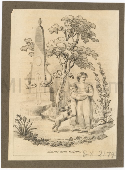 aimons nous toujours. Monochrome etching depiciting a garden with two children and a playful dog. …
