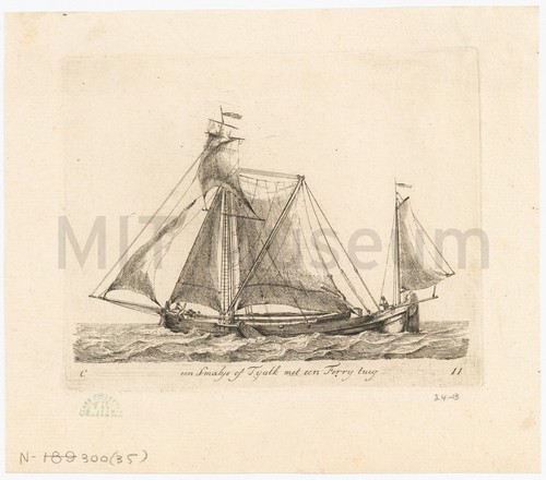 een Smakje of Tyalk met een Ferry tuig Etching depicting a side view of a tjalk (eighteenth-century Dutch barge) at …
