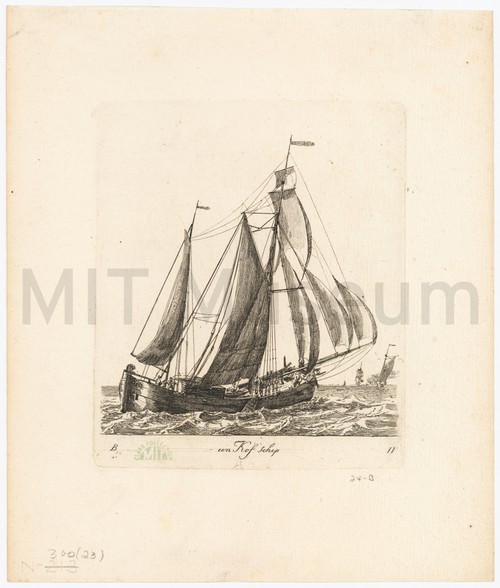 een Kof-Schip Etching depicting a three-quarters bow view of a two-masted ship at sea. …