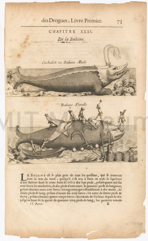 des Drogues, Livre Premier - page 73 Chapitre XXXI. De la Baleine Book page from the first volume of "Histoire generale des Drogues", with …