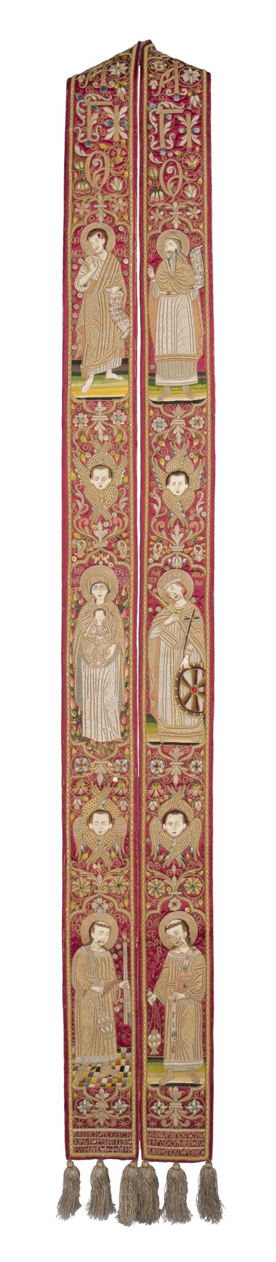 米特雷,米哈伊尔-费多罗维奇沙皇的祭品 自 14 世纪起,俄罗斯就有了为高级神职人员准备的、用黄金和珍珠装饰的奢华法衣。在十六和十七世纪,莫斯科克里姆林宫的作坊也流行这种奢华装饰的传统,尤其是在制作由沙皇宫廷捐赠的艺术品时。这块西奈半岛的盾牌是虔诚的莫斯科沙皇米哈伊尔的祭品。金板上装饰着雕刻的场景(创世纪、大天使、圣人和六翼撒拉弗),周围镶嵌着珍珠和宝石。这是一件相当内敛、平衡的艺术作品,其特点是布局精巧、色彩安排和谐。