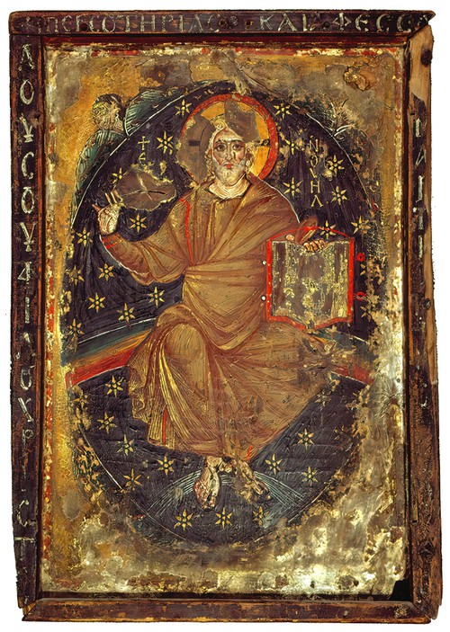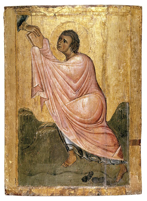 St. John the Evangelist dictates his Gospel to Prochoros From the Palaeologan era (thirteenth century) the elderly Evangelist is portrayed seated, …