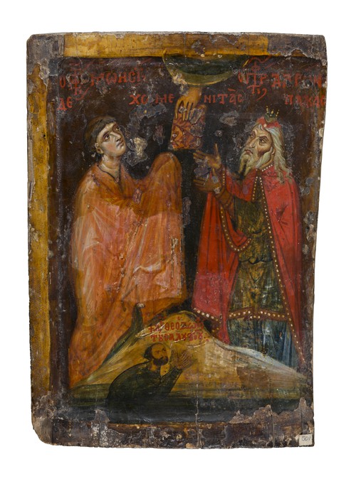 Prophet Elijah and Sinaitic Saints John Climacus and Anastasios of Sinai The three small icons incorporated onto the tripartite crown of the wood-carved …