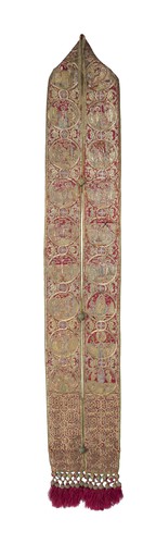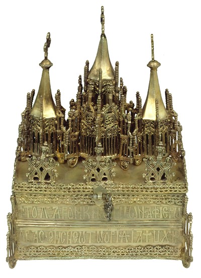 The lid is made of thin, wooden planks held together with iron nails. Three ornate hinges that are attached along the diameter of the lid allow half of it to fold up on top of the other half. The base is made of thin, wooden planks and two wooden rails that raise it from the ground. This basket was located in the Library of the monastery, and was used to store scrolls.
