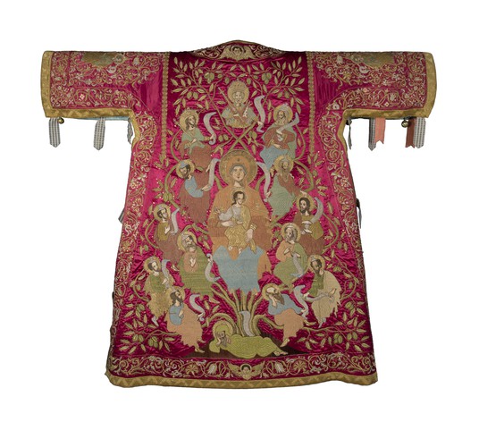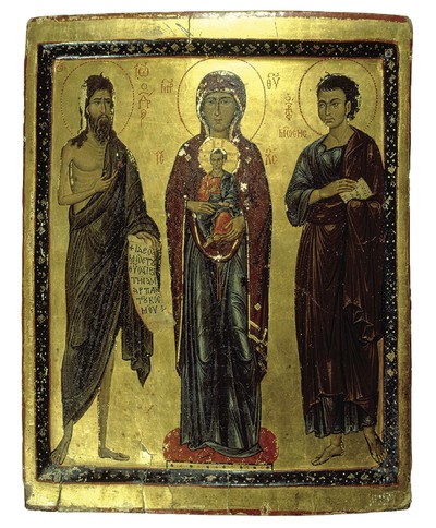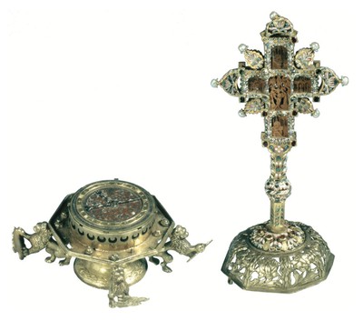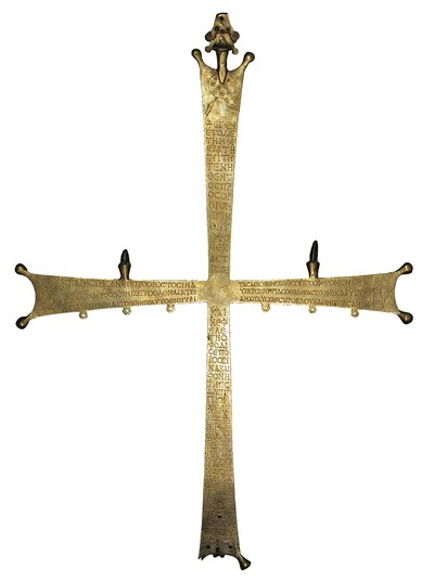 Medium sized metal cross, with a small protrusion on their bottom that allowed their placement on a base or a procession staff, served the needs of the imperial court, the military, and the church. At the same time, though, several of them expressed personal devotion, such as this cross of Leontios and Savvas, dedicated as a token of gratitude to the Holy Trinity. The bust of Christ in the intersection of the four cross-arms, that was rendered in gold-plate, and punctuated with niello, enhances the cross’s symbolism of victory and salvation. The full-body image of the Mother of God on the back-side must have also been important to the donors of the cross, who probably yearned for Her intervention.
