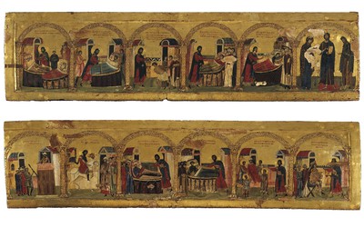 This small, silver-gilt triptych with angels engraved on the side panels contains a valuable reliquary-encolpion. The figure of Saint Catherine is carved in deep relief on agate stone, encircled in a gold border with white enamel, translucent and opaque colored enamels, precious stones, and a string of pearls. The attachment point of the suspension chain to the small-sized cameo was decorated with the scene of the Holy Mandylion, as was customary in Russian encolpia. The back-side is decorated with floral motifs in low relief, painted over with enamel. The particular techniques employed and the delicate features indicate that this lavish item was produced, together with other well-known artifacts of the second half of the seventeenth century, by the Kremlin workshops in Moscow for the royal court of the Tsar.