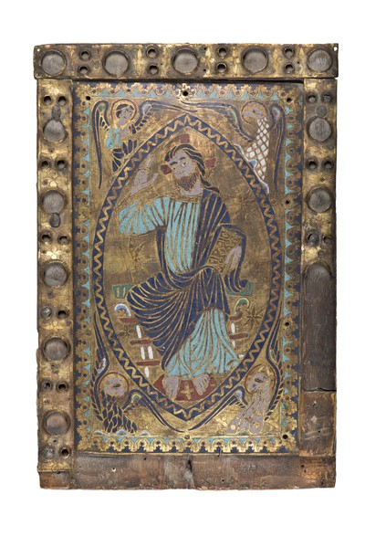 A silver sheet with religious scenes is symmetrically attached onto the rust colored leather cover. On the front, we see the Crucifixion in the center and the zoomorphic signs of the Evangelists on the four corners. The back-side is completely covered in silver sheet with pierced floral decorative patterns surrounding the figures of the Mother of God, Moses, and Saint Catherine, as well as the donors, the Prince of Wallachia Mihnea II and his wife Aikaterina. The style of this item is similar to cover number 33.2, and it is one of the early specimens of a large group of lectionary covers that make use of silver sheet attached to velvet substrate, a technique that allows for many variations, and guarantees the durability of the item.