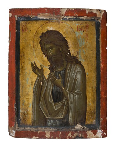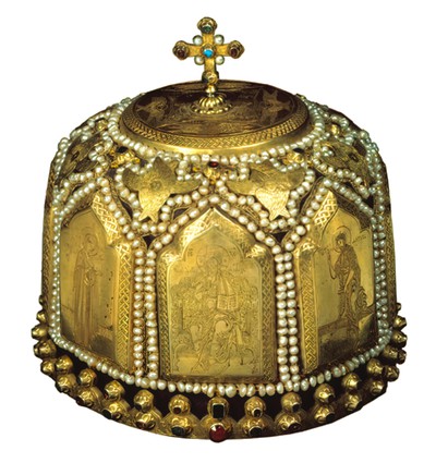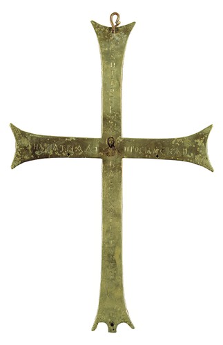 This silver-gilt case from Georgia was the offering of Priest-monk Joachim Skordillis of Crete, and is decorated with the monumental scenes of the Crucifixion and the Descent into Hades. The narrow sides of the case are decorated with the figures of the Mother of God as the Bush between Moses and Saint Catherine, the Evangelists, and a carefully engraved dedicatory inscription. The background is engraved with dense winding vines with lotus flowers and other blossoms. The slender figures, complex fabric folds, and the overall austere and gentle characteristics carved in deep relief, contrast starkly with the floral decorative pattern style, indicating that this is the work of an Eastern Georgia workshop, an area that was influenced by Islamic art in the sixteenth century.