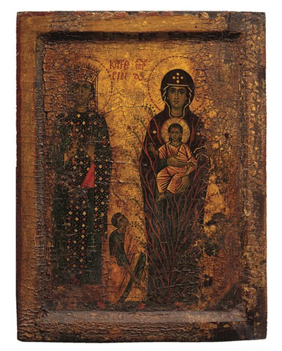 The Mother of God as Burning Bush with a winged Christ Child is depicted amidst the Sinai landscape in the center. Prophet Moses and Saint Catherine stand at her side, while the bottom part depicts the walls of the Sinai Monastery and the church of Saint Catherine. The main scene is complemented with several smaller scenes (Moses receiving the tablets of the Law, the translation of the holy body of Saint Catherine by angels, and the sun’s ray that radiates from the Episteme Mountain summit to the Bush below).