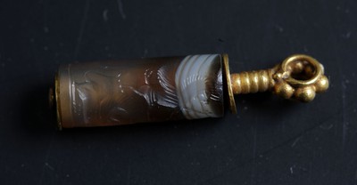 Attic black figure cup with deep bowl, high “wishbone” handles. Side A: battle over a fallen warrior, with two nude figures bearing away the corpse; Ramage suggests that the nude figures might represent Sleep and Death, rather than mortal combatants. At the right, a separate battle between two warriors, one of whom wears a horned helmet. Side B: the hunt for the Calydonian boar. Two hunters attack the boar from the left, and three hunters, including a woman (Atalanta, kneeling), attack from the right. A dog savages the boar’s back. Above, painted inscriptions read “Drink, and be merry!” (above the boar, on the left) and “Boar” (on the right). Interior: a running youth or warrior. The inscription surrounding him has been interpreted as a garbled potter’s signature. Mended from fragments; foot missing, restored. Attributed to the Painter of the Sardis Merrythought Cup (Ramage).
