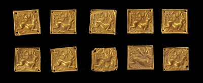 Collection of gold ornaments and jewelry, belonging to one or more fabric items. According to Roosevelt (Roosevelt 2003, 632): “eight fragments probably belonging to various items of jewelry (two small pins or pegs with spherical heads (MM6283), two pomegranate bead pendants with cylindrical ribbed tubes (MM6284), and four other pendants with cylindrical ribbed tubes and small pins or pegs decorated with six-petal rosettes (MM6285) and assorted forms of stamped à jour appliqués. In addition to one figure of a winged bull, with human head and horns (lamassu?; MM6277), 25 lotus buds (MM6281), 26 lotus flowers (MM6282), and 41 crescent-shaped chain sections (MM6279) probably formed a lotus chain with alternating buds and flowers. Forty-one small eight-petal rosettes also may belong with this design group (MM6280). The configuration of the large number of remaining rosettes is unknown: 29 with eight petals each (MM6278), seven with pins or pegs (MM6286), and 192 with four petals each (MM6287).” Many items are pierced for attachments to fabric.