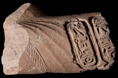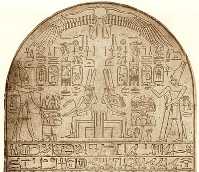 The stele was excavated in Ahmose's cult center at Abydos, found in 1902, in two pieces. A twin scene in the upper lunette shows king Ahmose presenting offering tables to seated Tetisheri (whose name is within some of the cartouches).[1] Both the left and right scenes have variations of the offering tables, Tetisheri's arm poses, as well as Ahmose's. Besides Tetisheri's representation and nomen depictions in the lunette, her name appears in the hieroglyphic text below along with that of Nefertari who is referred as talking with Ahmose about making offerings and buildings to Tetisheri.