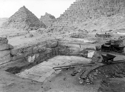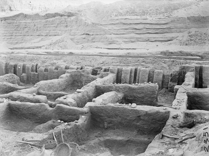 Photograph of a row of stone-cut female statues on the north wall of the inner chamber in the Tomb of Queen Meresankh III.