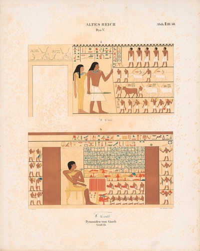 This is a photograph of the Tomb of Queen Meresankh III in the state that it was discovered in the 20th Century by archaeologists. This is the East wall of the Tomb where Queen Meresankh III and her mother, Queen Hetepheres II, ride on a skiff pulling papyrus to honor the goddess, Hathor.