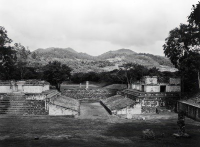 Copan Album: Volume 3, Page 15; Written on page: "Mound 14, looking N.E. Pyramid 16 in the background. Taken / before clearing forest."